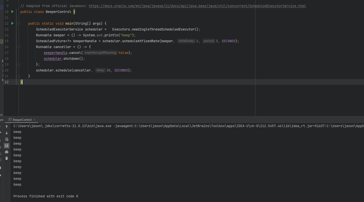 }beeperHandle is a ScheduledFuture instance which will allow us to cancel the computation (or at least attempt to cancel the computation) without evaluating its result just yet. It can also be used to query the computation about being done, cancelled and, of course, to retrieve its result. In this example, we define a Runnable that uses the ScheduledFuture beeperHandle to cancel the scheduled job after 30 seconds. We are thus expecting that we will see 10 “beep”s in our output.